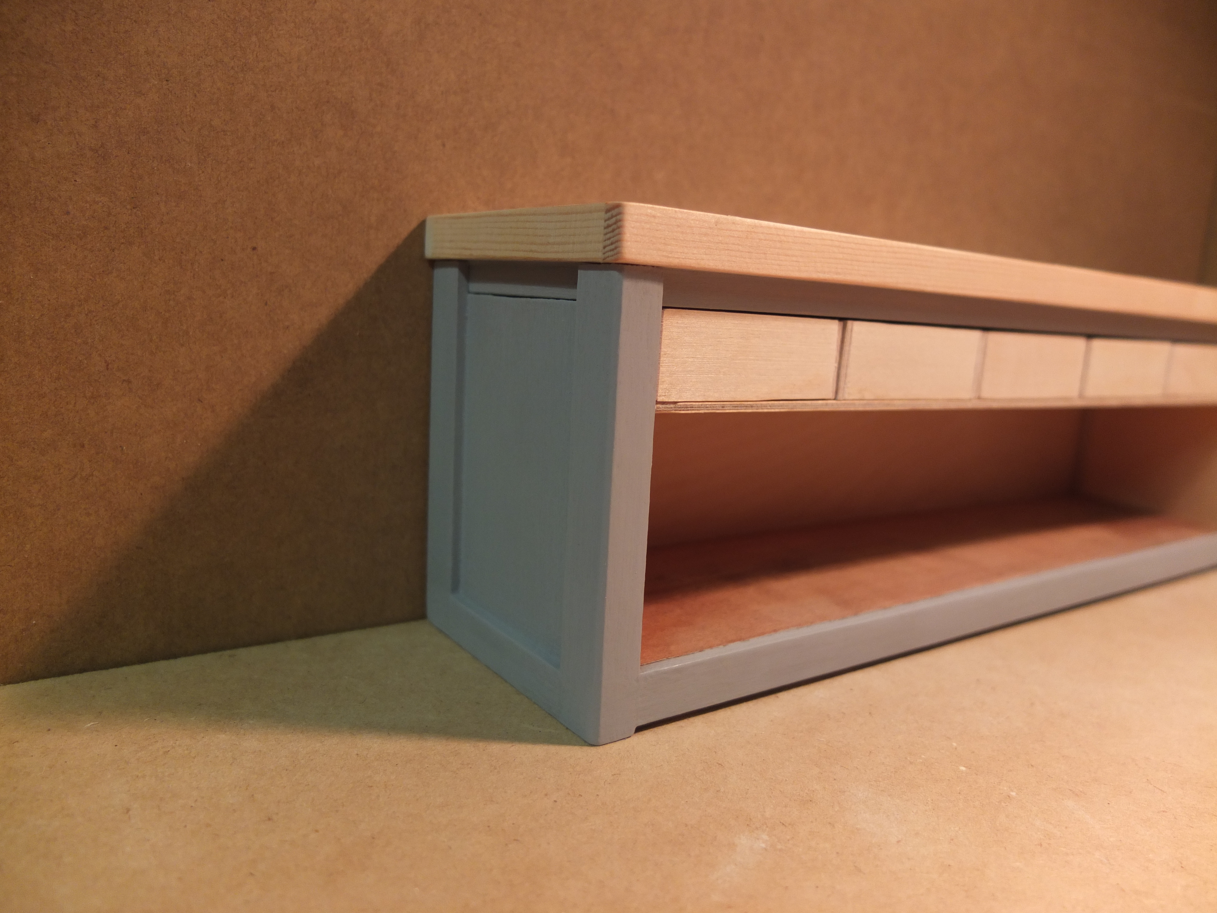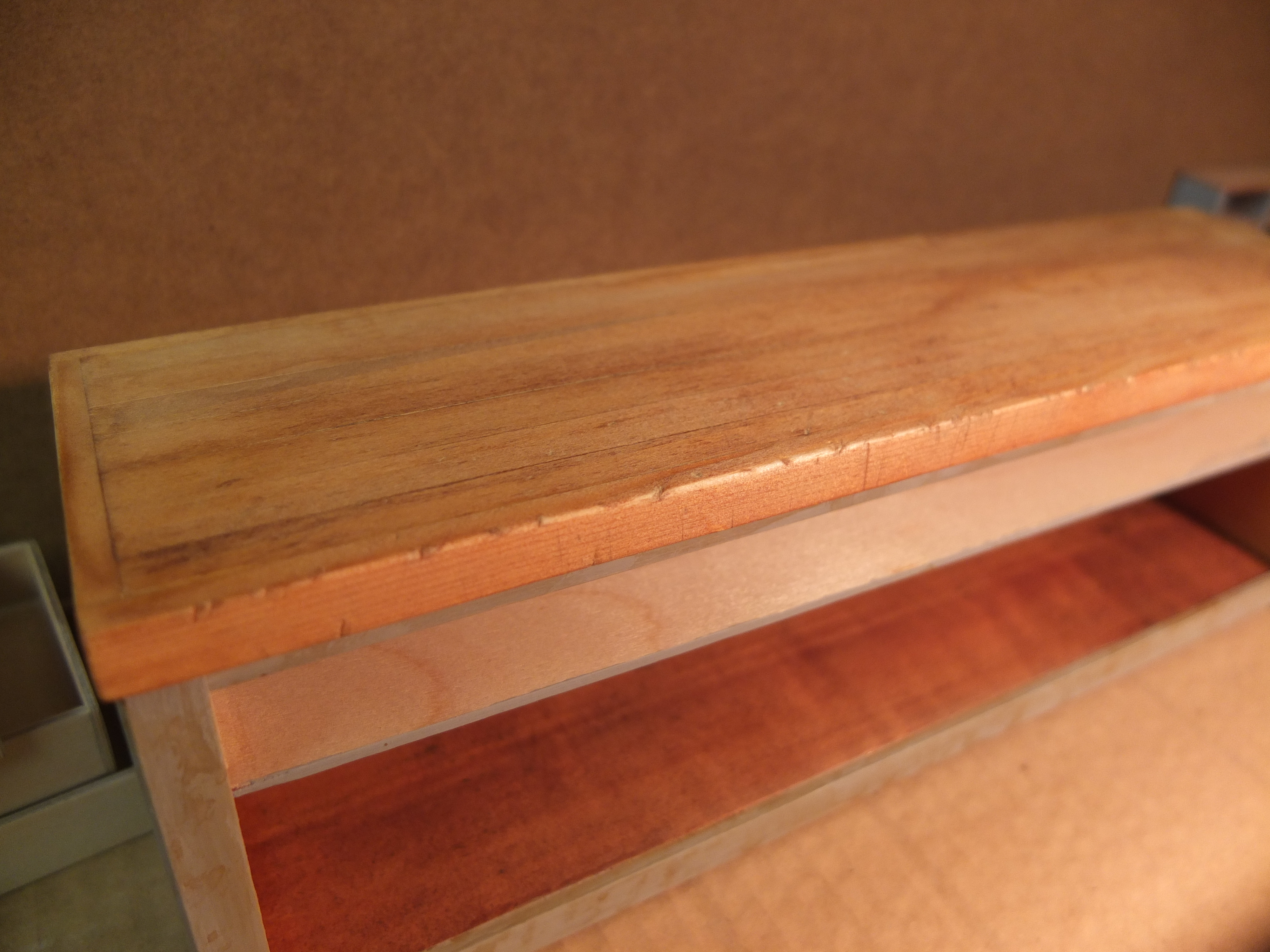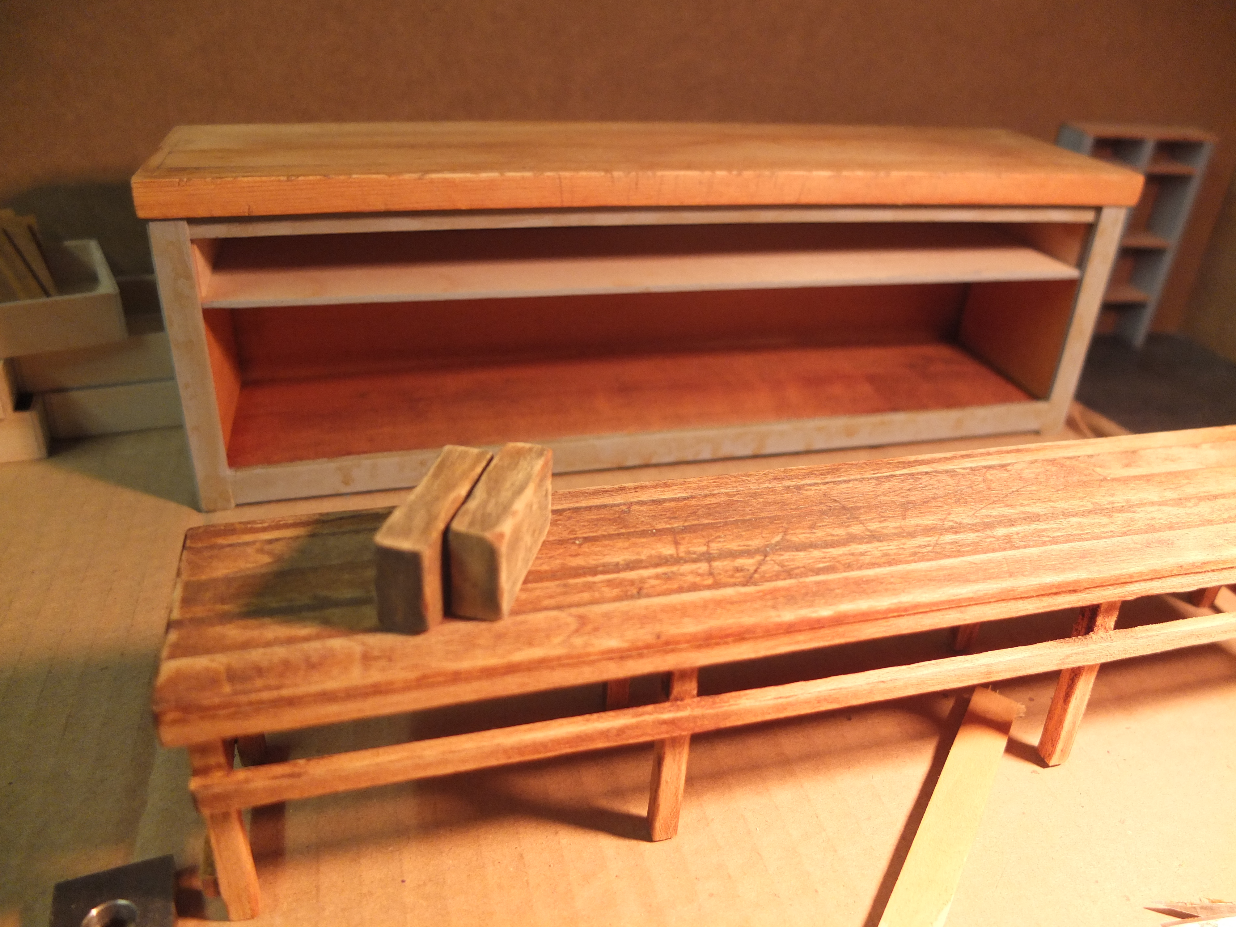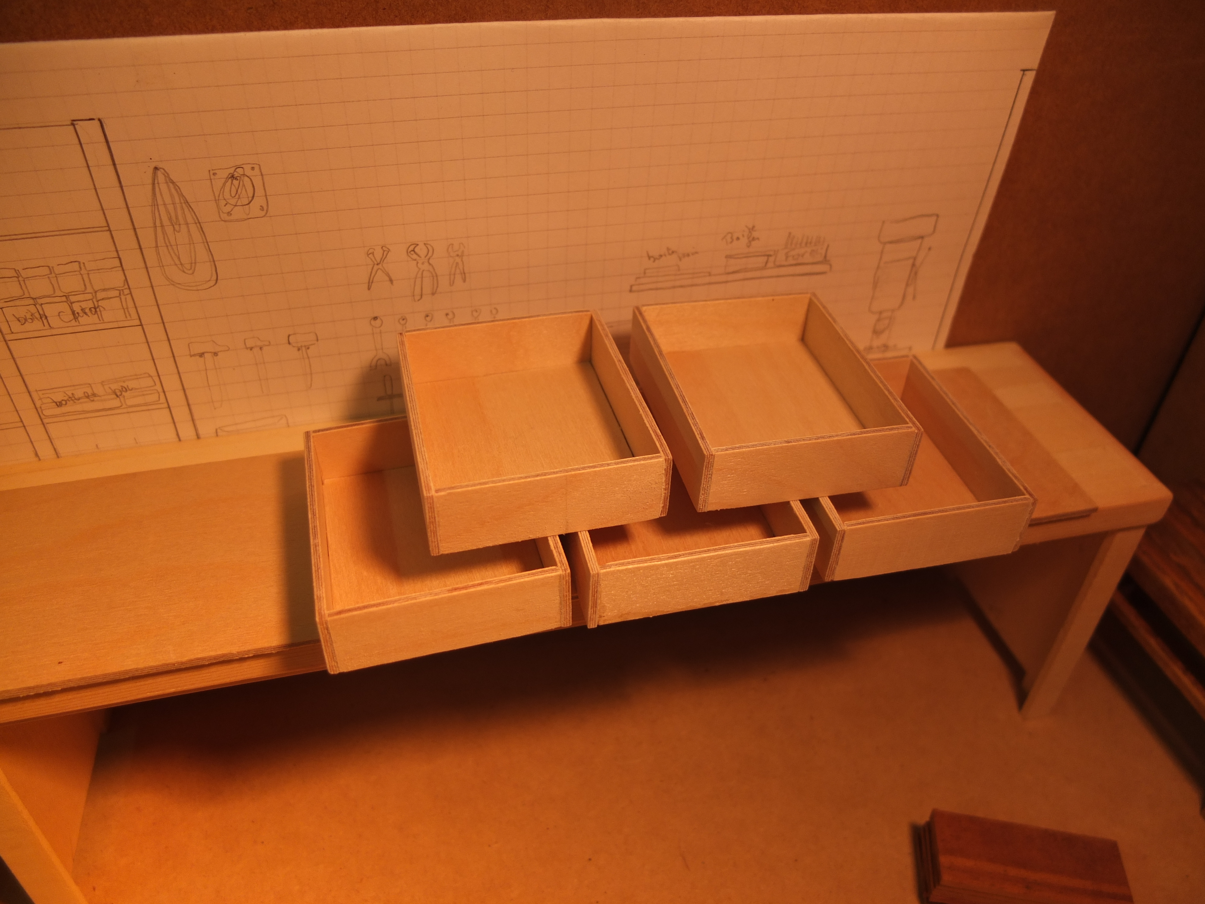 Start of the manufacturing of the workbench: The species used were poplar for the workbench, 2mm plywood for the drawers, and exotic wood (don't ask me which one) for the facades, recovered from a location I don't know.