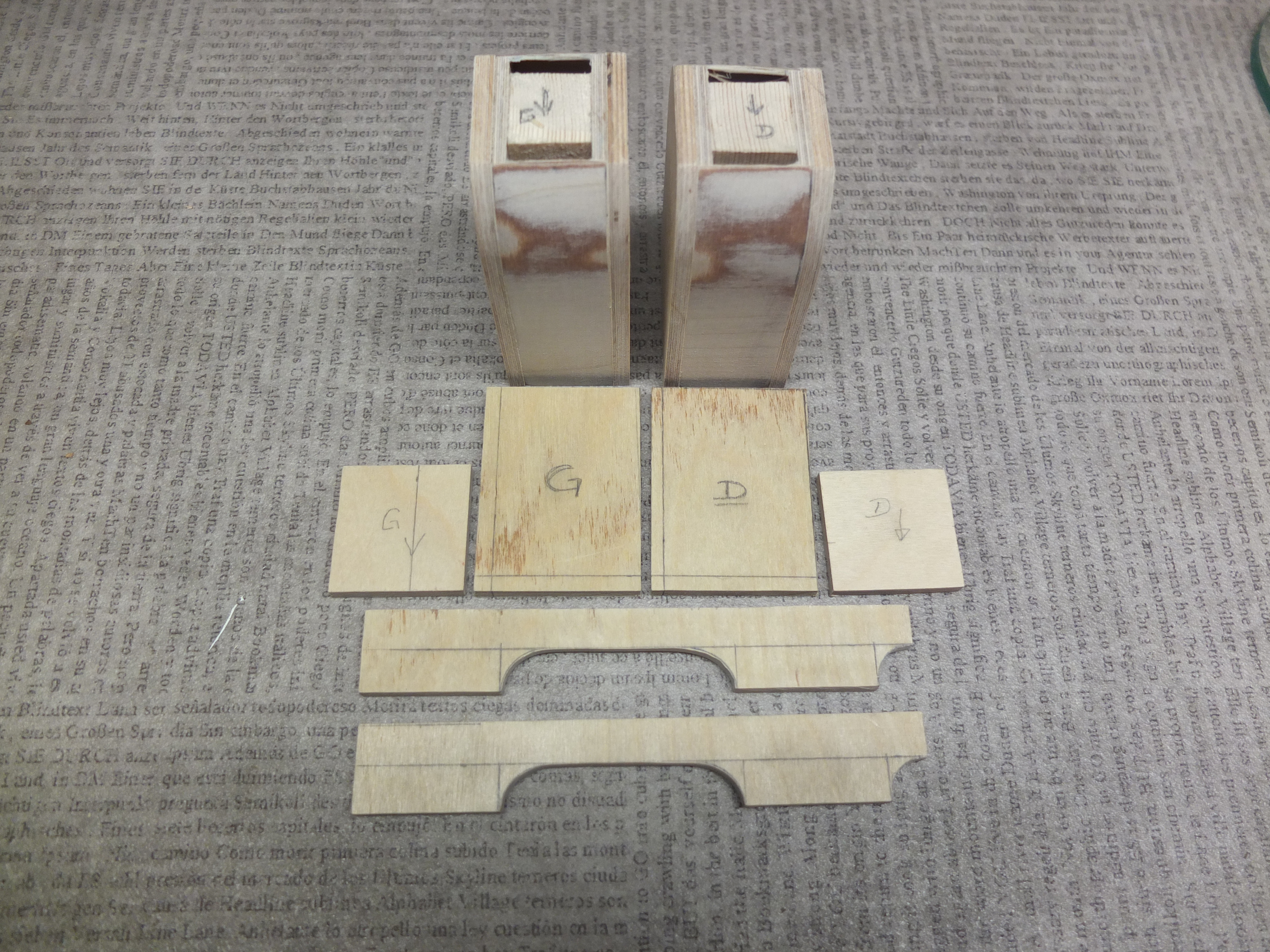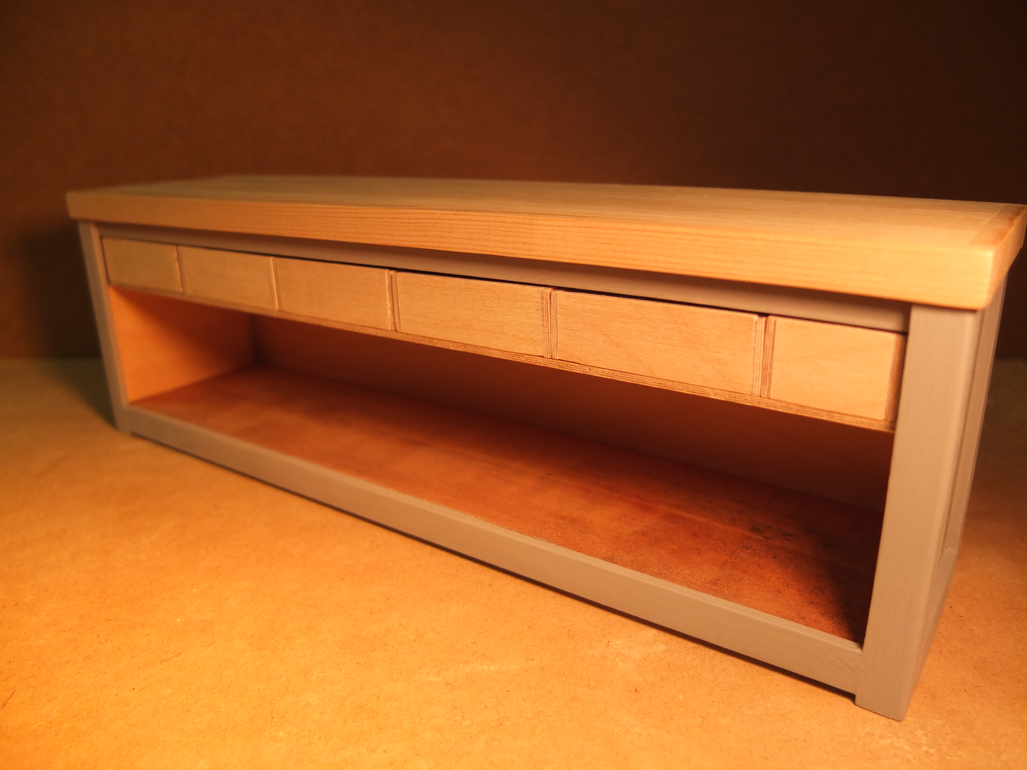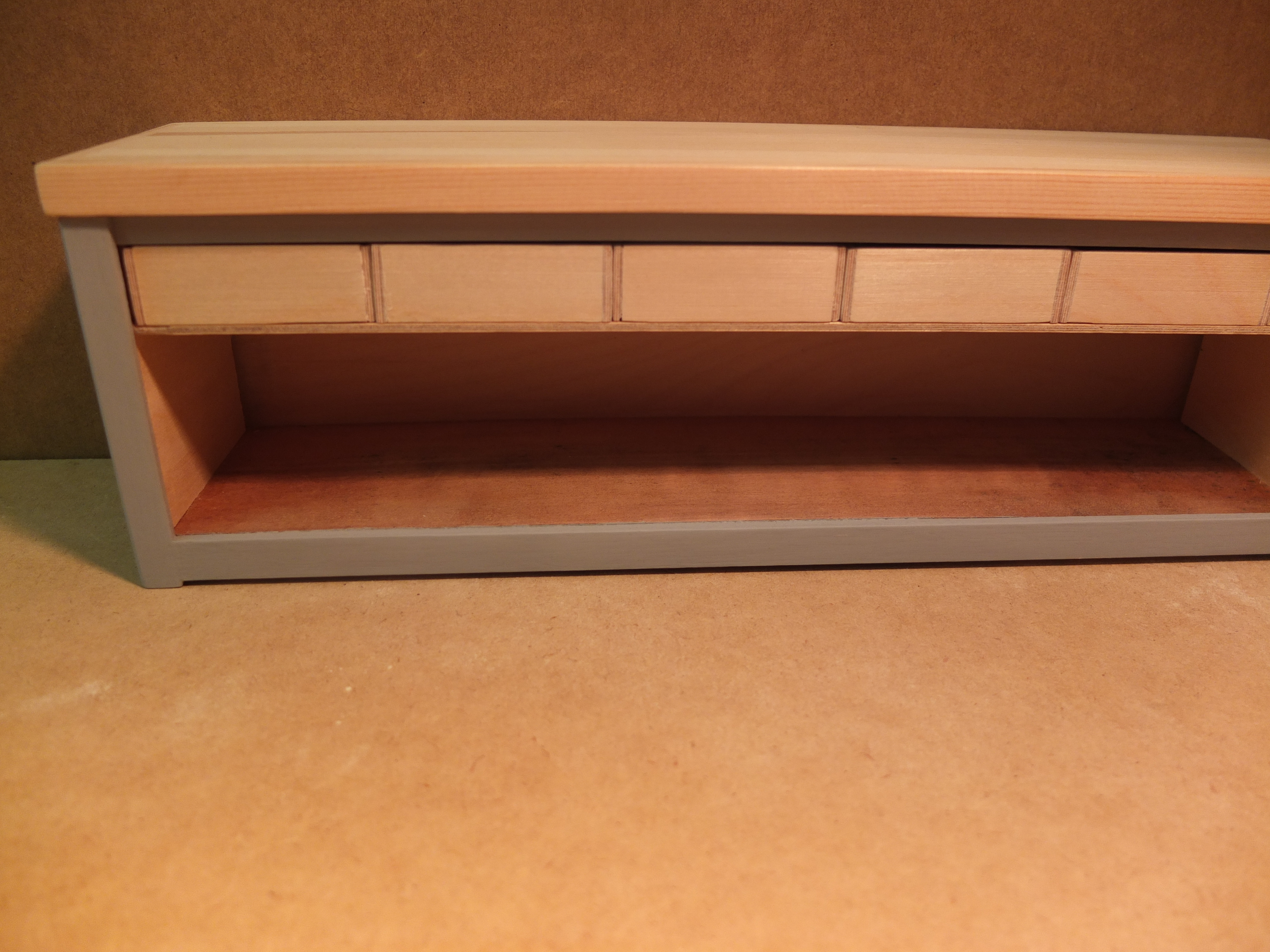 Start of the manufacturing of the workbench: The species used were poplar for the workbench, 2mm plywood for the drawers, and exotic wood (don't ask me which one) for the facades, recovered from a location I don't know.