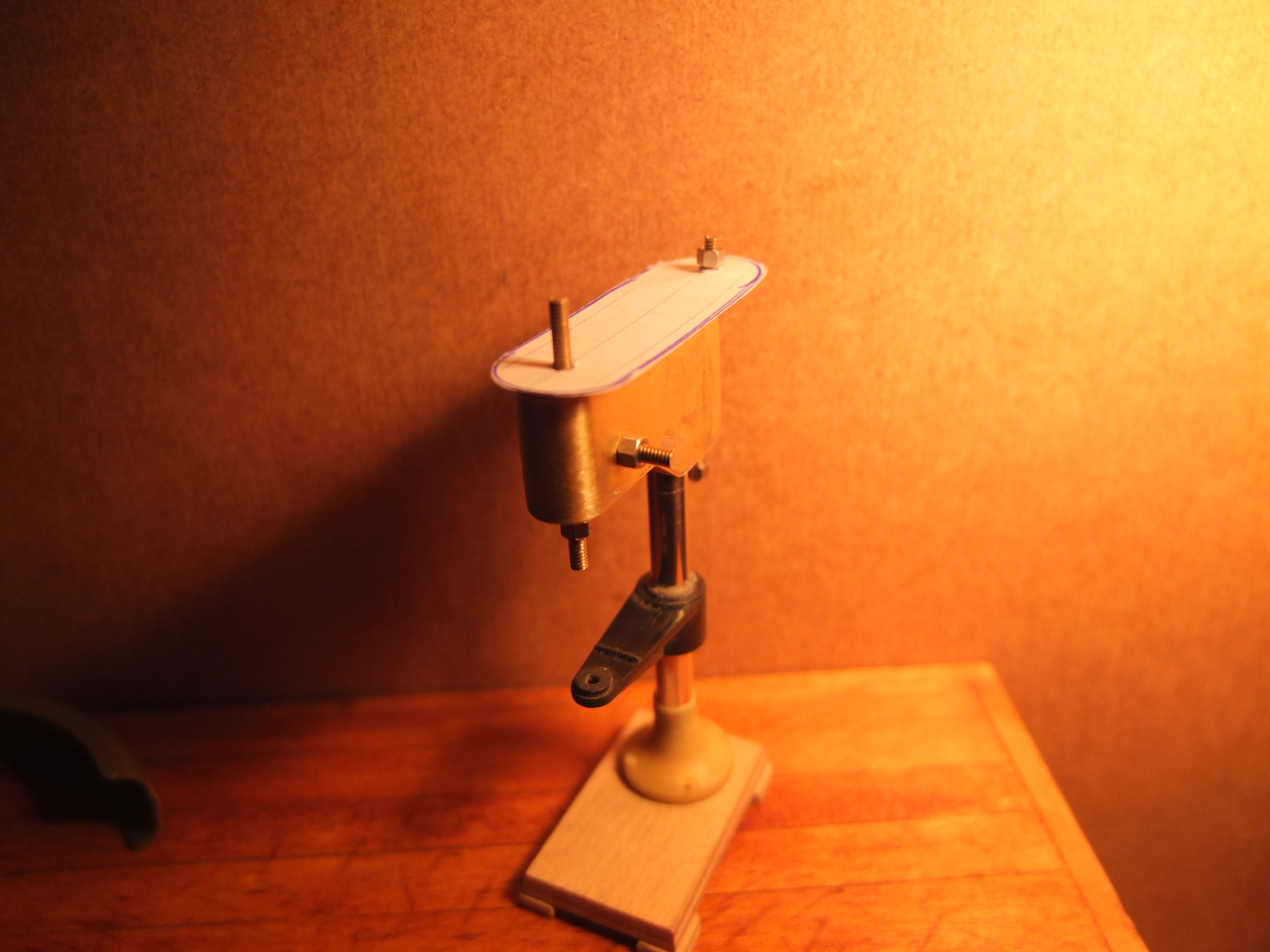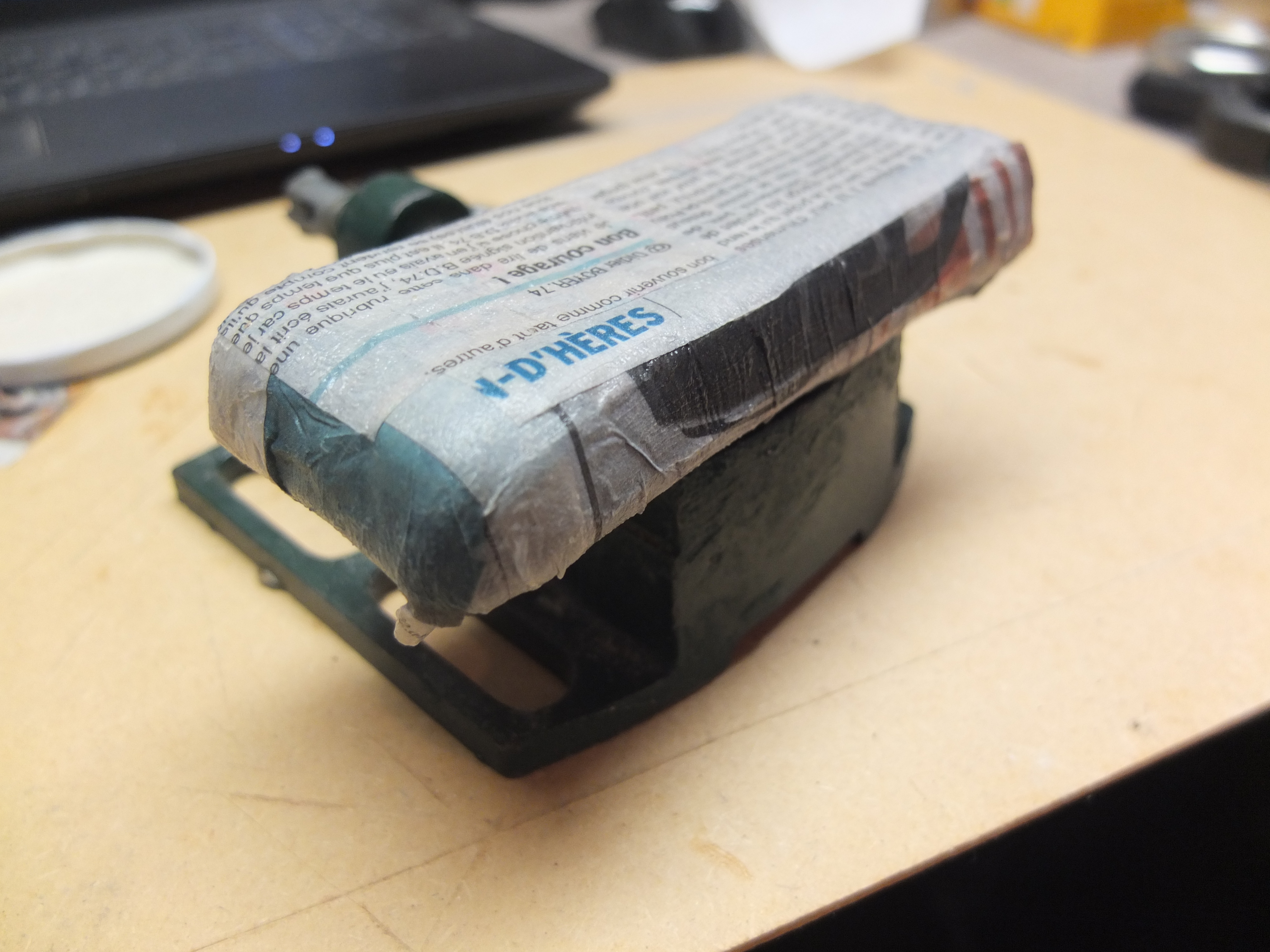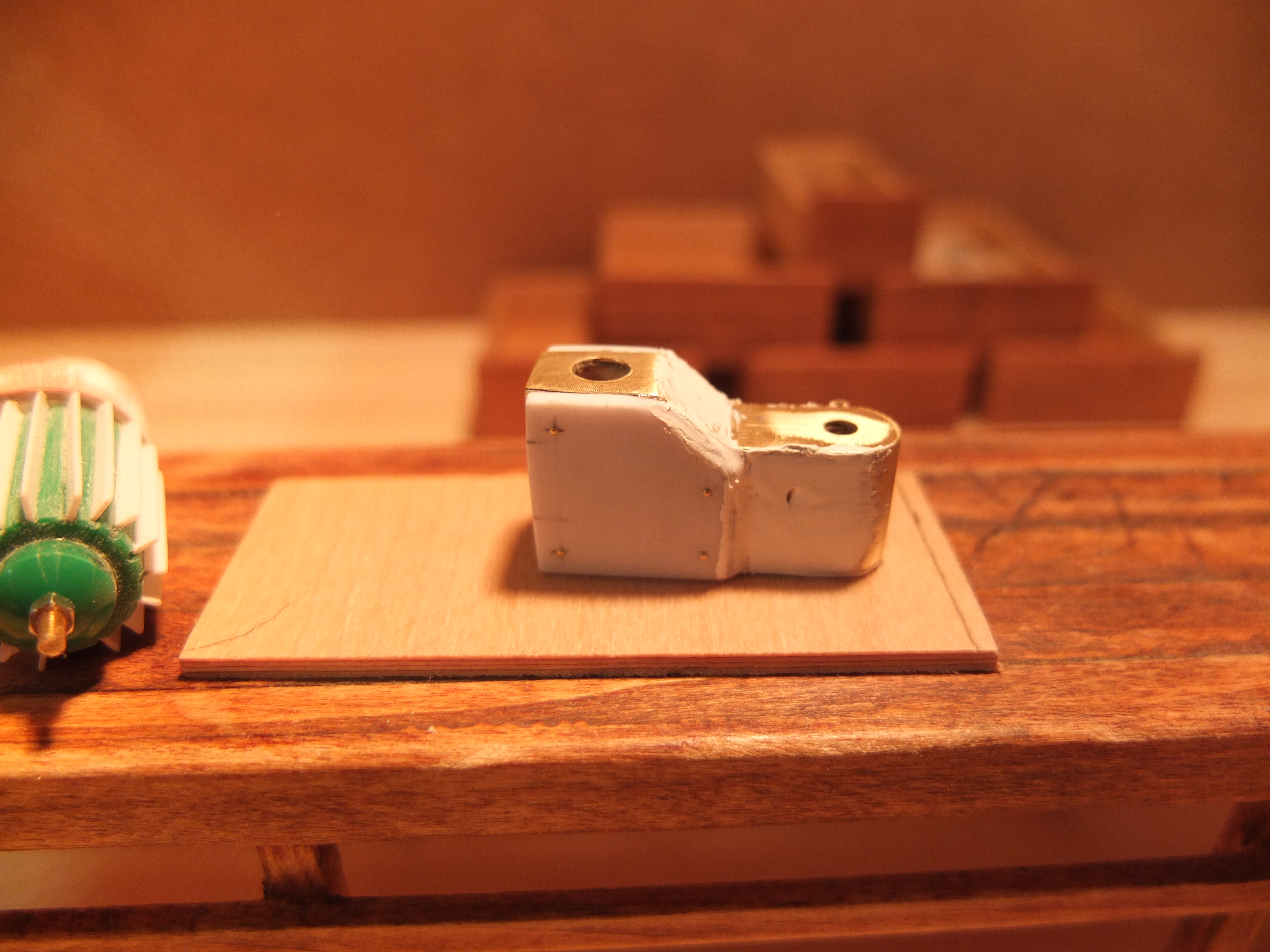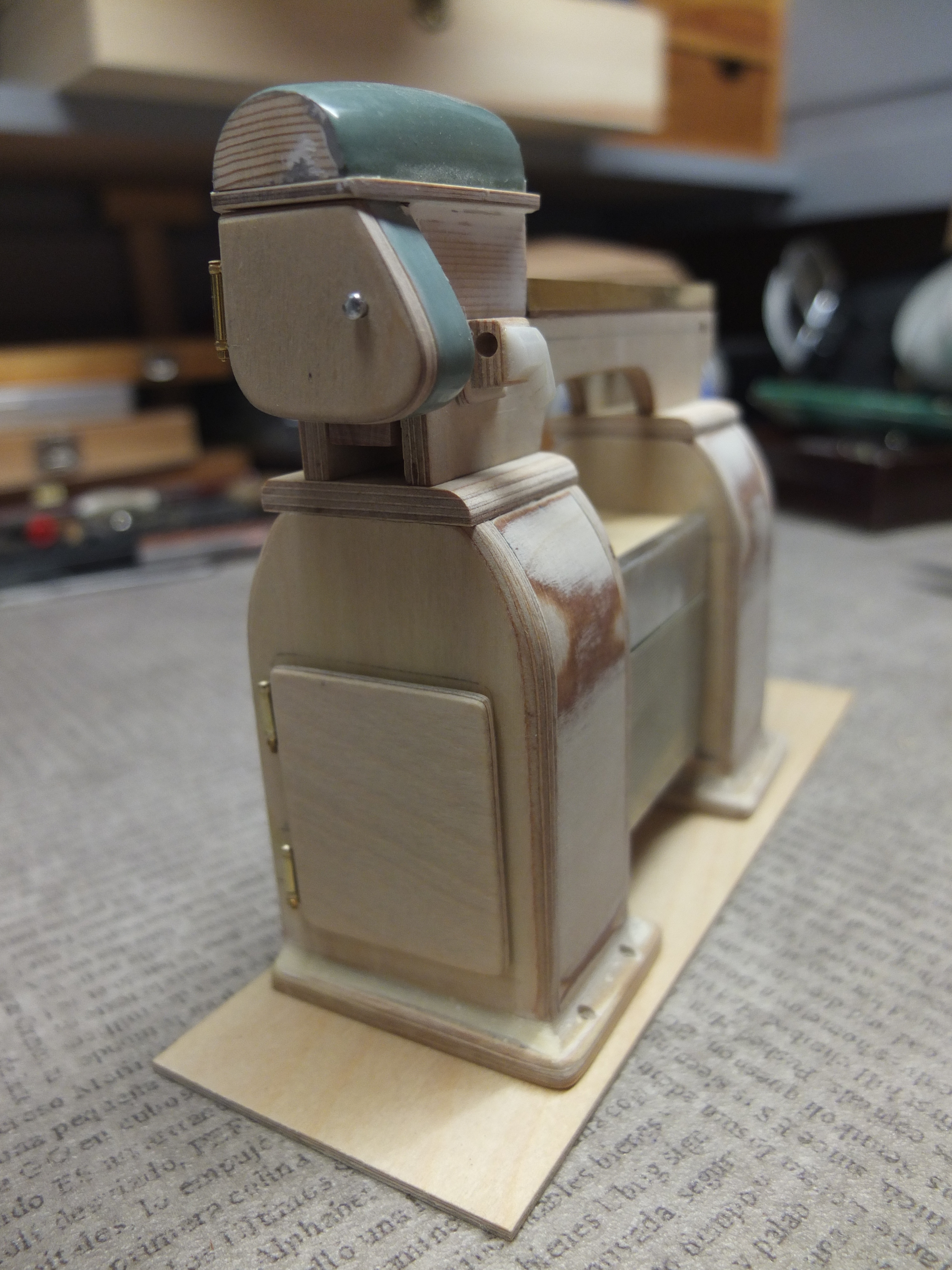 Plywood 2mm for the bottom, and 0.5 for the sides. For the latter, these are two sheets formed and glued together. after drying and shaping: Two plastic sheet "cheeks" are added on the sides to add volume and micro rivets are inserted to give a little more realism (the green thing on the left is one of the many attempts to imitate an electric motor, but it will not be retained) Just like the trick, it’s still very far from finished but let’s say that the biggest one is done, there will be left at the base to do, the turntable and some details and still refine two or three things, assemble, paint.....