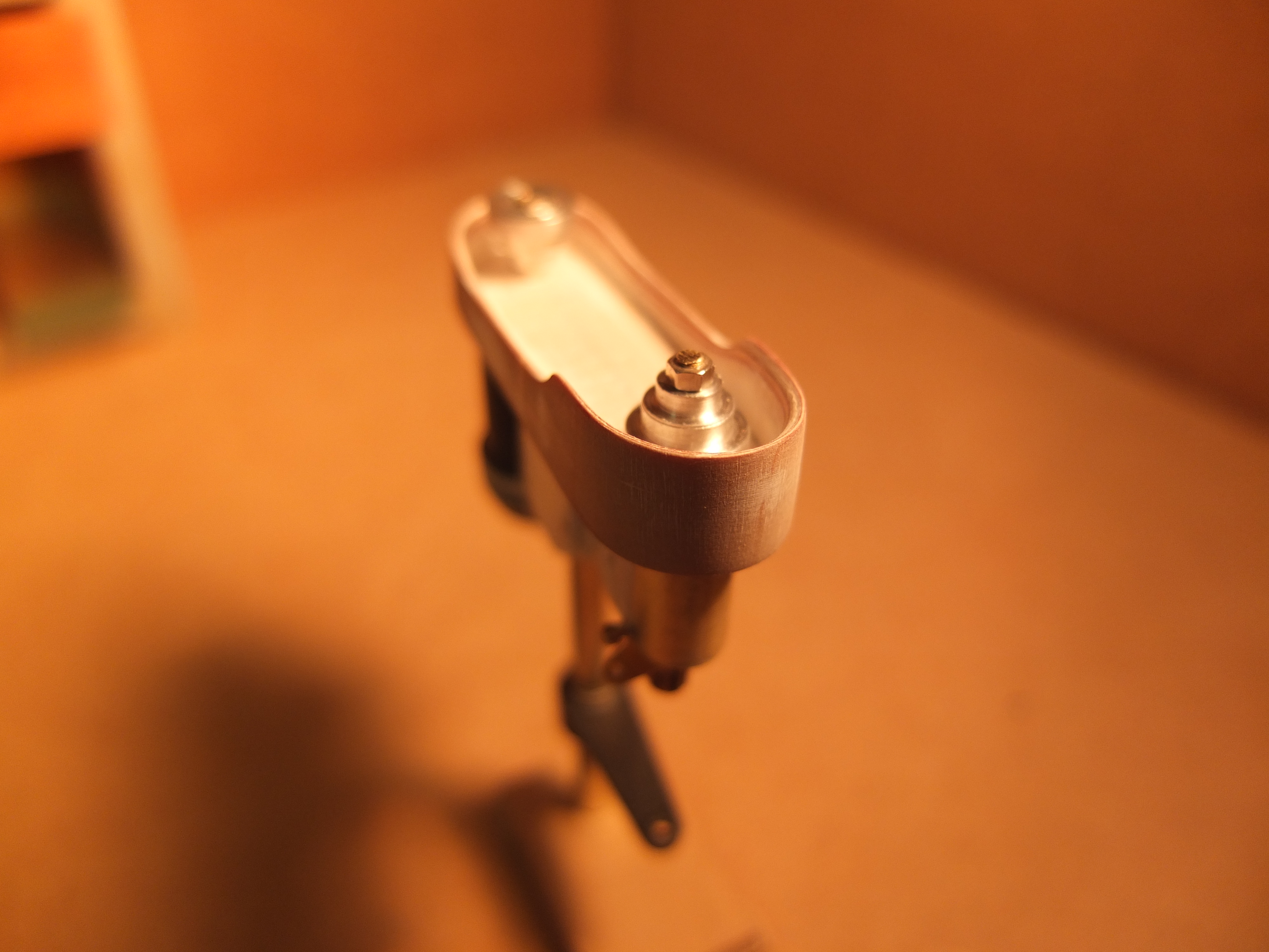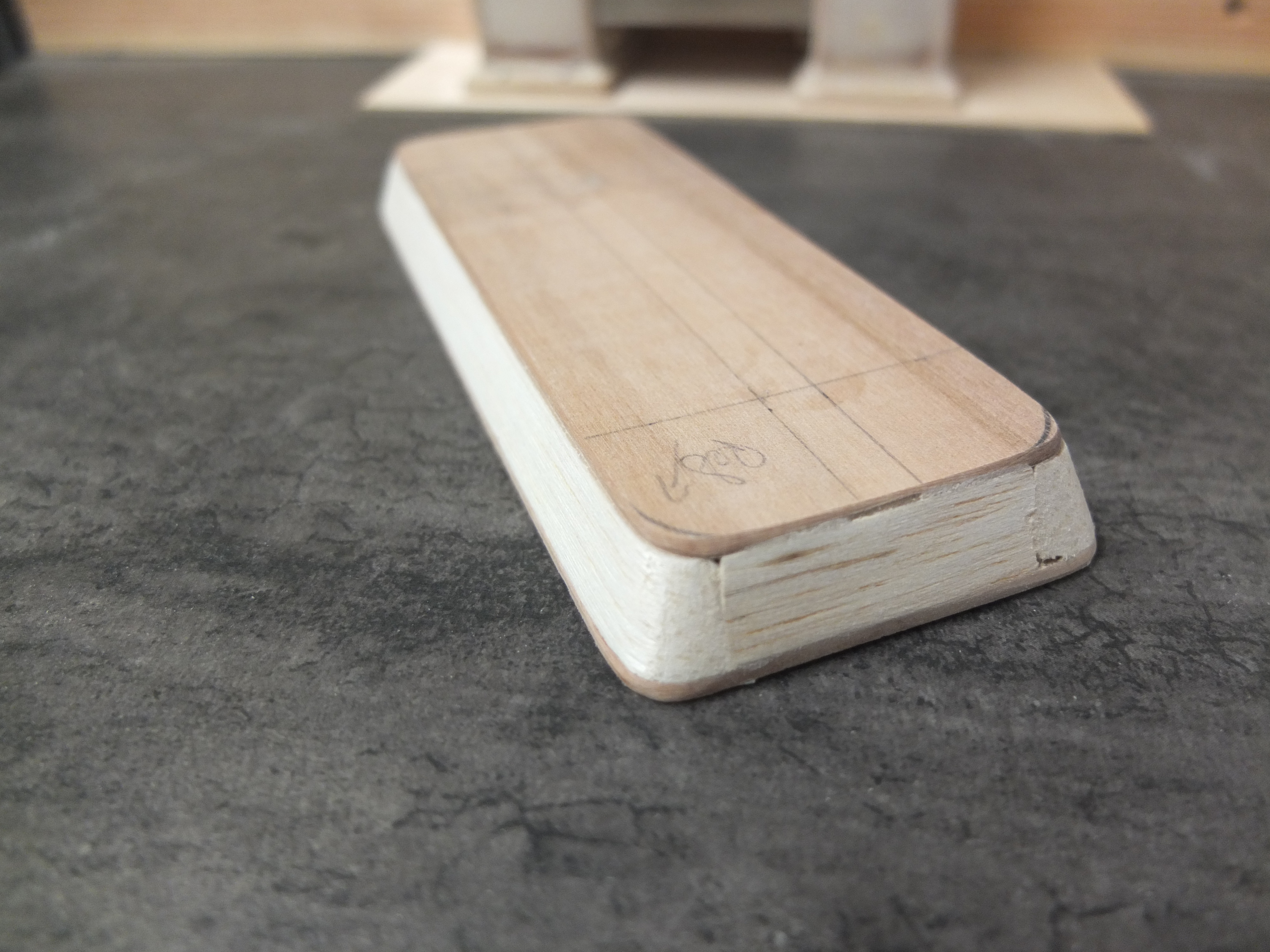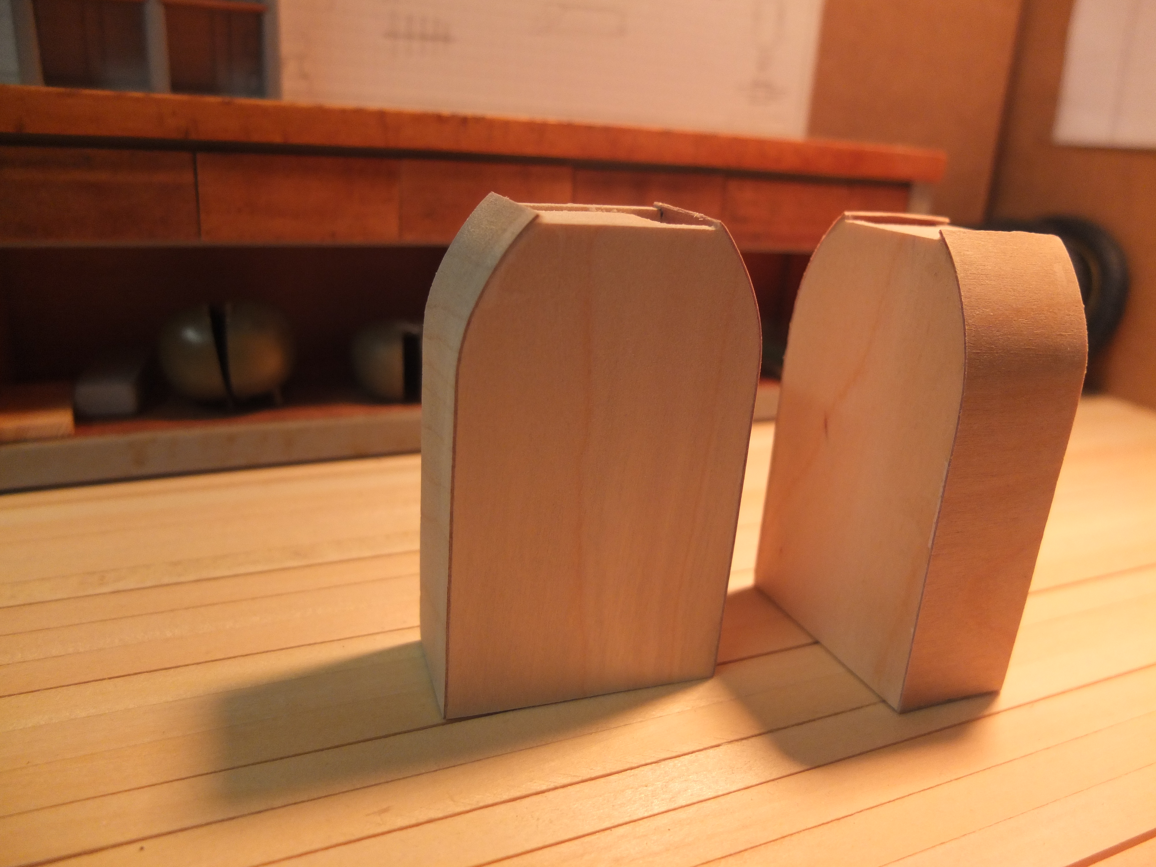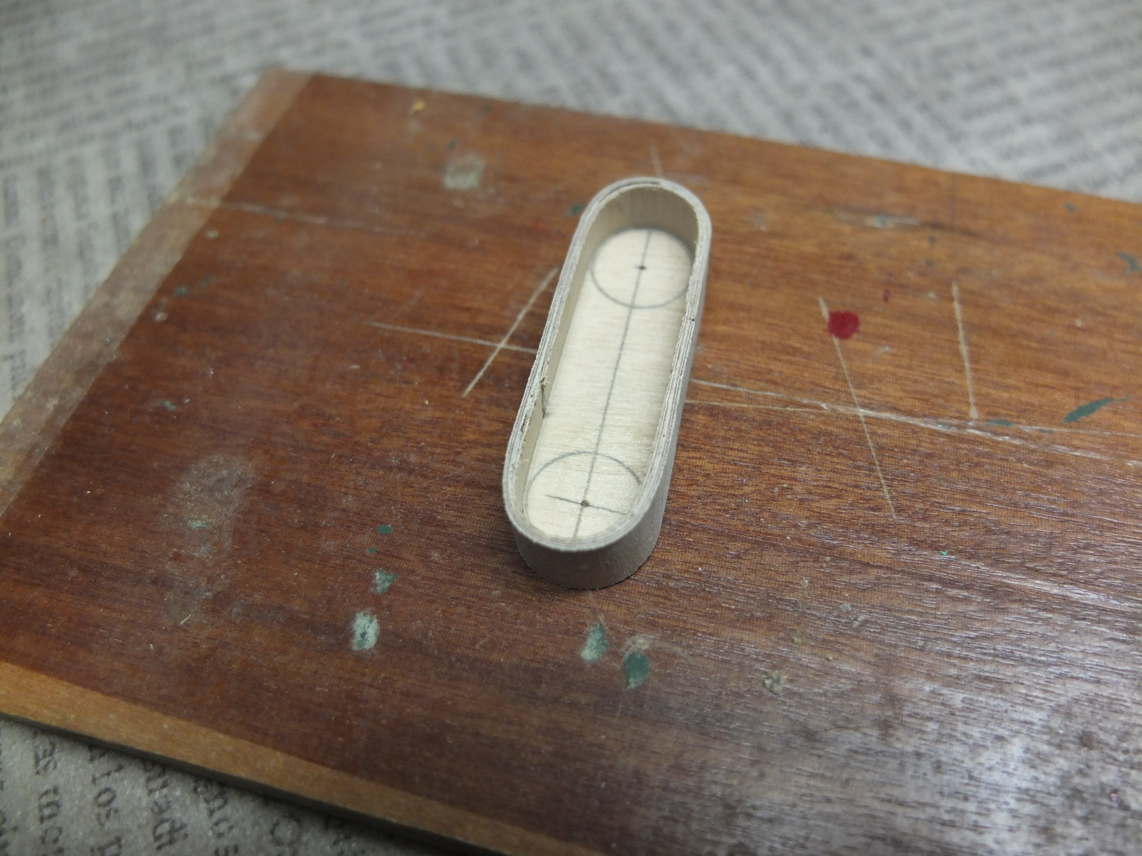 Plywood 2mm for the bottom, and 0.5 for the sides. For the latter, these are two sheets formed and glued together. after drying and shaping: Two plastic sheet "cheeks" are added on the sides to add volume and micro rivets are inserted to give a little more realism (the green thing on the left is one of the many attempts to imitate an electric motor, but it will not be retained) Just like the trick, it’s still very far from finished but let’s say that the biggest one is done, there will be left at the base to do, the turntable and some details and still refine two or three things, assemble, paint.....