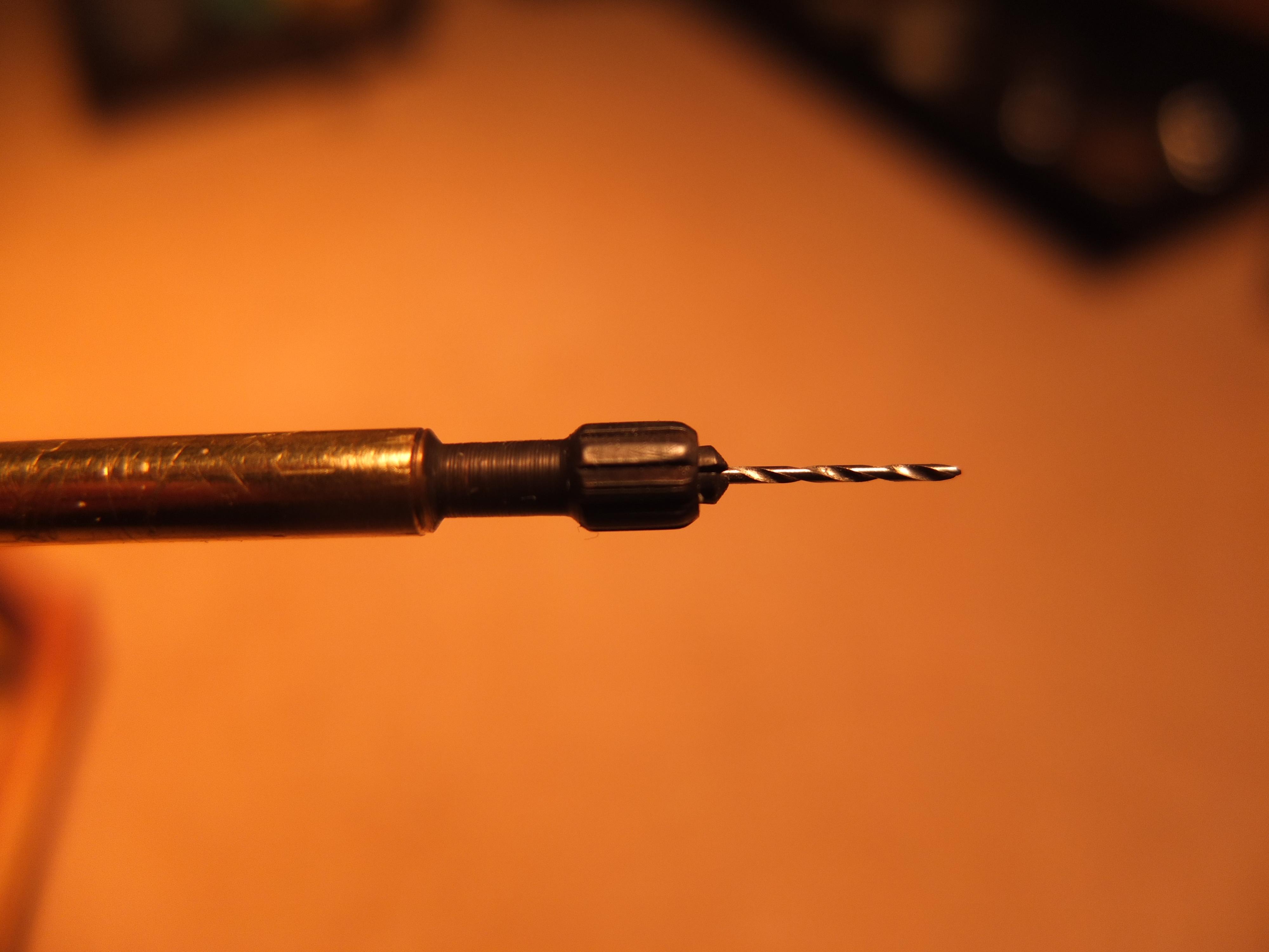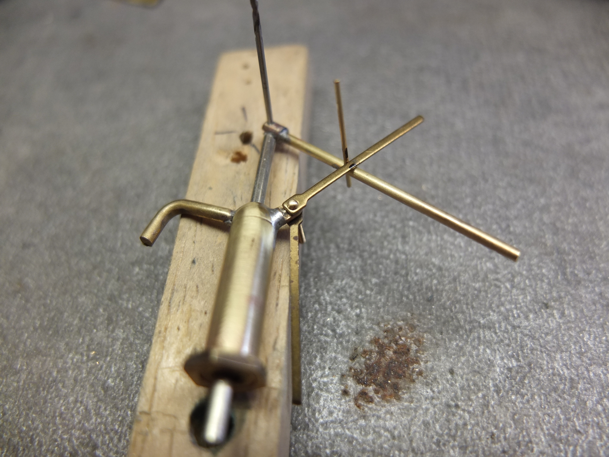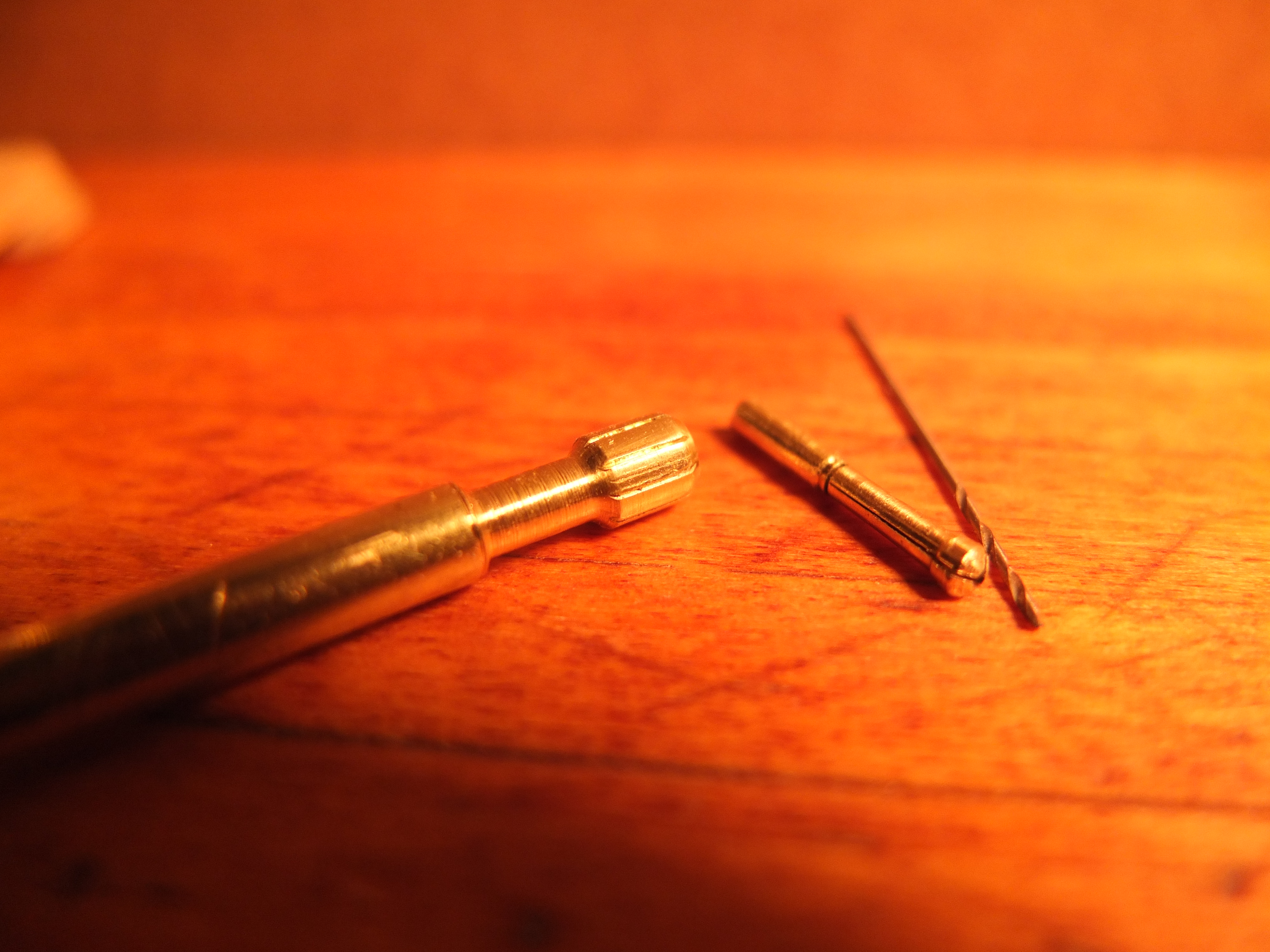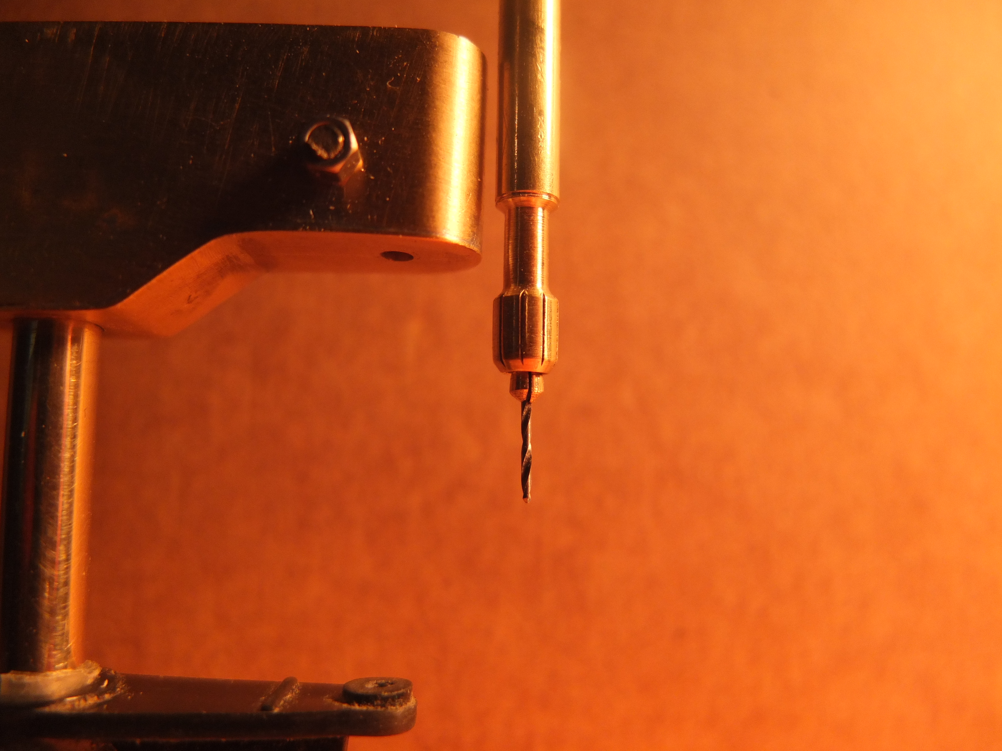 on the left the mandrel in progress, the part in the middle comes from a lead holder 0.5 and the drill bit on the right also in 0.5 test in front of the drill body to see what it will give: the mandrel is in place (temporarily) and setting up the stop system: