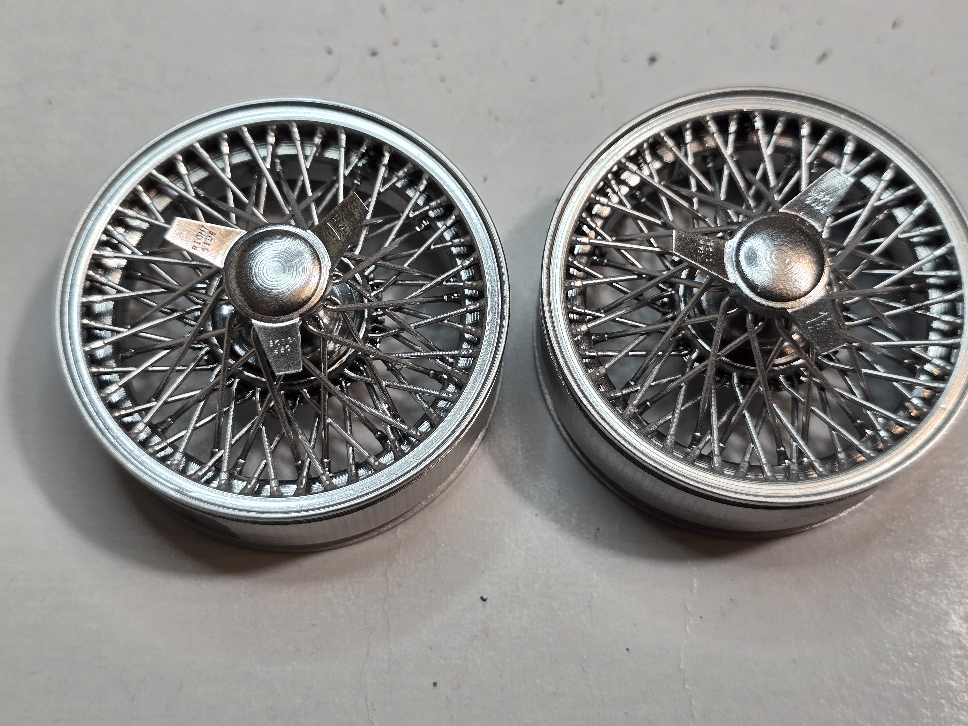 Just thought I would post a couple pictures of Colin's wheels the Jaguar XKE, a couple different view angles. I think Colin did a really good job in making these, the detail is really nice. Even have little valve stems for them. I used Spaz Stix glossy black primer and the Spaz Stix chrome paint. I think they came out okay. Colin even "marked' the wheels for either the front or rear.