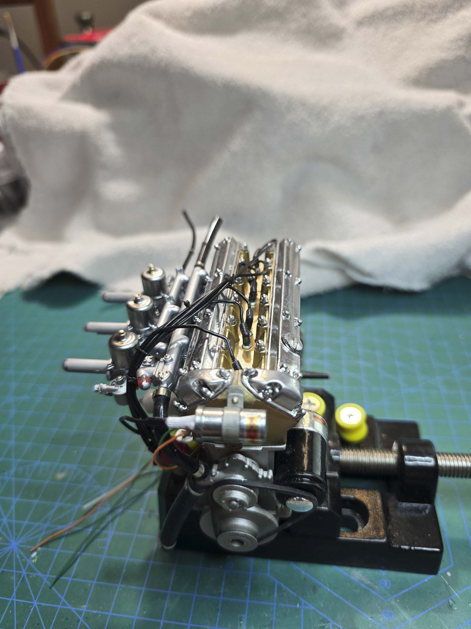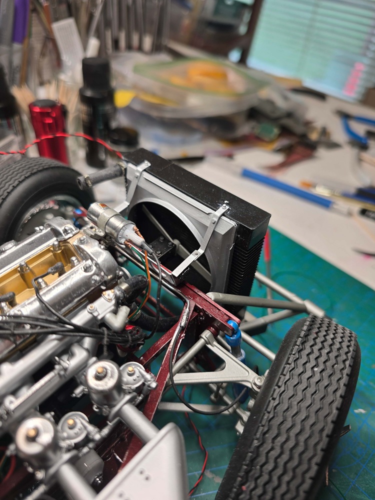 Greetings. Just a couple of update pictures - engine bay and a picture of Colin's Radiator fan. Would have been hard to get a shot of once the top tanks was added. Excuse the bubble wrap - protecting the paint on the floor pan.